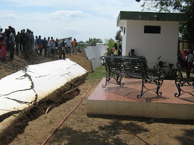 A team of about ten Hatian workers has been working all week digging a trench around the perimeter of the Children's Center in order to lay drainage lines. Right before noon yesterday, without any warning, the entire front section of the perimeter wall, which provides security for the Center, collapsed into the ditch. Our team was scattered throughout the property, tending to our various responsibilities, and few of us even noticed...until we saw the children running from the buildings. Our thoughts ranged from: "Oh man, what's it going to cost the Center to rebuild the wall?" to, "Well, duh, you shouldn't be digging so close to the wall!"; that is until we saw the terror in the eyes of the children as they were screaming and crying and stampeding out into the yard! It was then that we realized what the children were thinking: "It's another earthquake!", and all they wanted was to reach a safe place outside of the buildings. Even twenty-four year old Jocelyn who lost his leg in Port au Prince after the earthquake tried to run for safety, when he fell and was almost trampled by the other children. If it hadn't been for one of our team members who, holding a child in one hand and using the other hand to cover Jocelyn and hold the children back from running over him, he probably would have been severely injured. As it was, he had already fallen on his leg and had reopened the fresh wound of the amputation. The team immediately grabbed up children in arms and began comforting them and reassuring them that this was not an earthquake, the wall just fell because of a construction error! The entire experience struck terror in the hearts of all the children and adults who have been rescued from the earthquake. It broke our hearts as a team to realize that long after the physical wounds have healed, these children will carry psychological and emotional scars that may never heal. It was a very traumatic day for all! One man from Port au Prince told a team member that God just keeps pounding the people of Haiti, over and over again. Some of us were wondering just how much these precious people can take? Praise God, no one was hurt. The children were all a safe distance away. The supervisor of the project said that seconds before the wall fell, he was watching the men work, and noticed a light shifting of the sand. He yelled for the men to get out of the way, and it literally saved their lives! Thank you, Lord, there was not another tragedy!